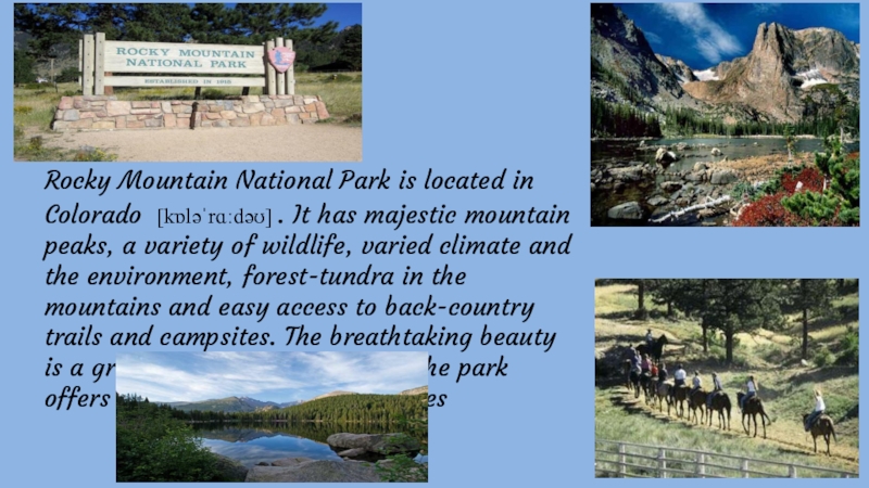 Слайд 25Rocky Mountain National Park is located in Colorado [kɒləˈrɑːdəʊ] . It has majestic