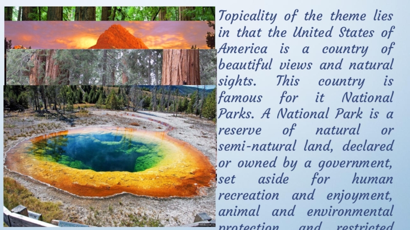 America is a country of beautiful views and natural sights. This country is famous for it National Parks. A National Park is a reserve of natural or semi-natural land, declared or owned by a government, set aside for human recreation and enjoyment, animal and environmental protection, and restricted from most development.