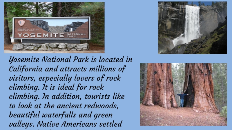 Слайд 24Yosemite National Park is located in California and attracts millions of