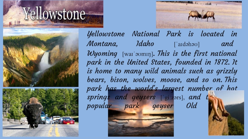 Слайд 22Yellowstone National Park is located in Montana, Idaho [ˈaɪdəhəʊ] and Wyoming