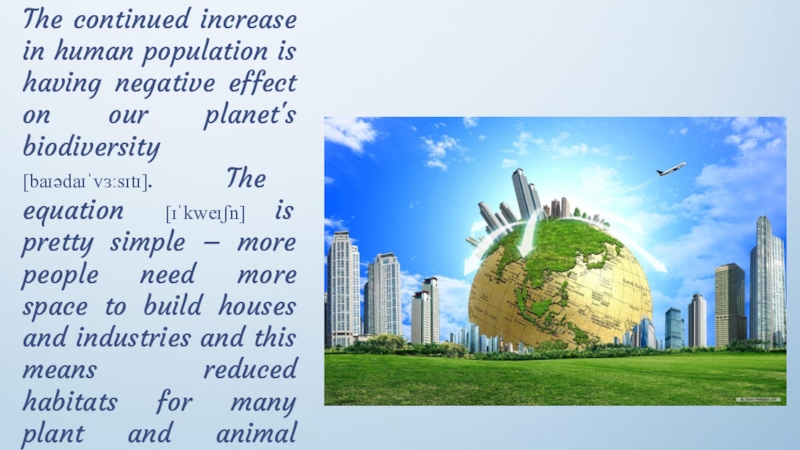 our planet's biodiversity [baɪədaɪˈvɜːsɪtɪ]. The equation [ɪˈkweɪʃn] is pretty simple – more people need more space to build houses and industries and this means reduced habitats for many plant and animal species.