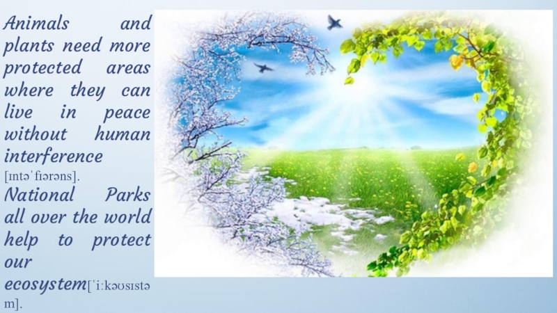 in peace without human interference [ɪntəˈfɪərəns]. National Parks all over the world help to protect our ecosystem[ˈiːkəʊsɪstəm].
