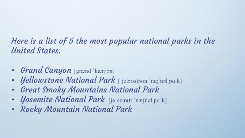 Слайд 20Here is a list of 5 the most popular national parks