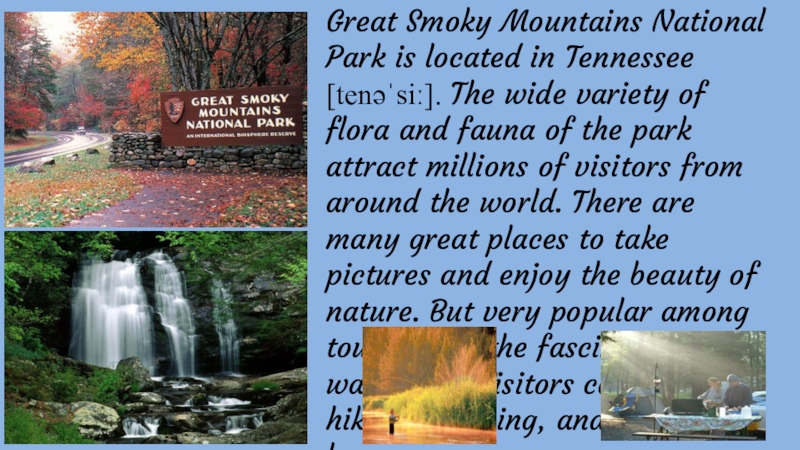 Слайд 23Great Smoky Mountains National Park is located in Tennessee [tenəˈsiː]. The wide