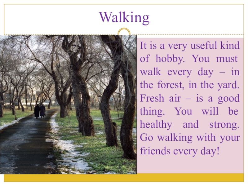 walk every day – in the forest, in the yard. Fresh air – is a good thing. You will be healthy and strong. Go walking with your friends every day!