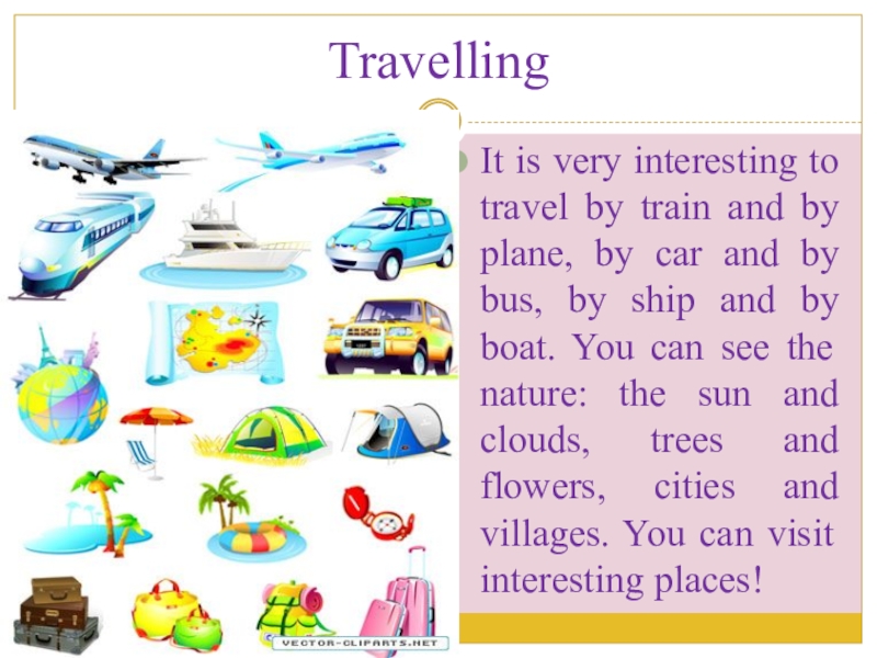 by car and by bus, by ship and by boat. You can see the nature: the sun and clouds, trees and flowers, cities and villages. You can visit interesting places!