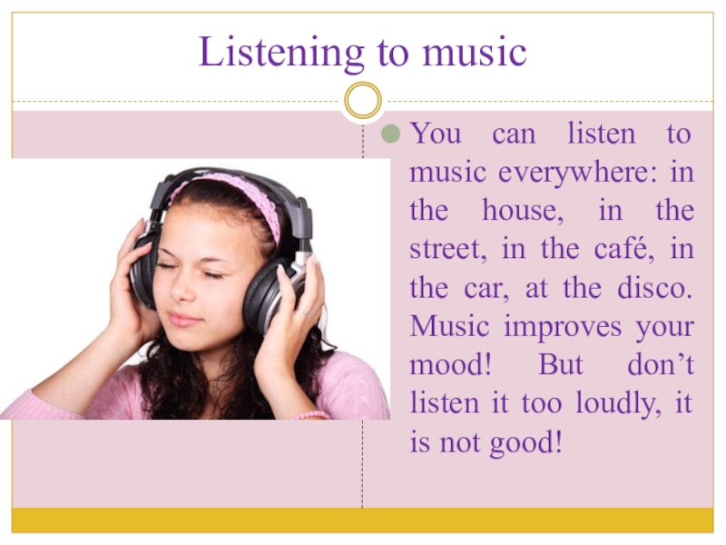 house, in the street, in the café, in the car, at the disco. Music improves your mood! But don’t listen it too loudly, it is not good!