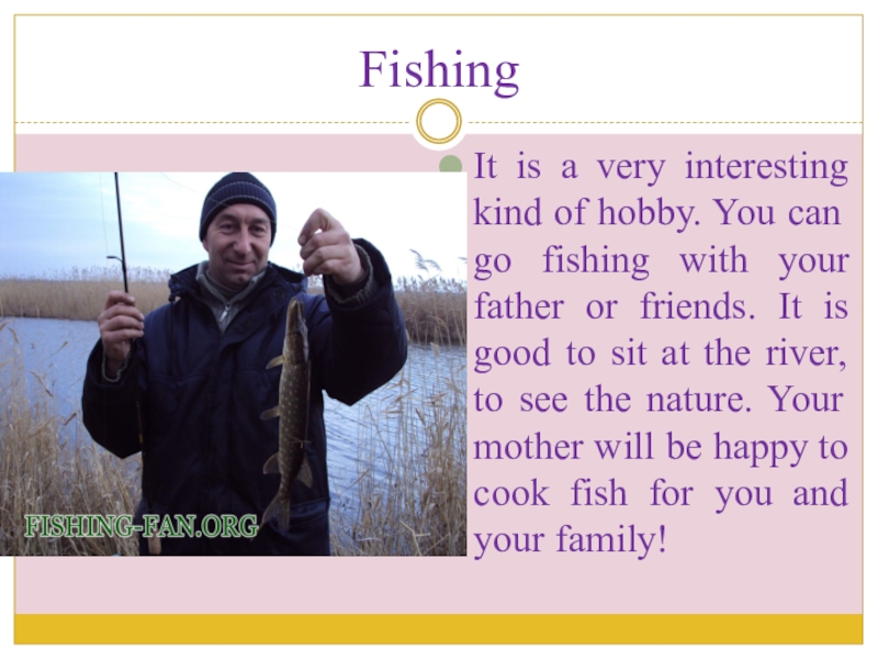 go fishing with your father or friends. It is good to sit at the river, to see the nature. Your mother will be happy to cook fish for you and your family!