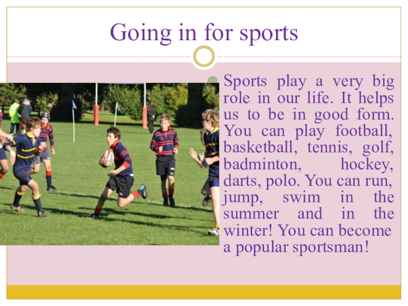 life. It helps us to be in good form. You can play football, basketball, tennis, golf, badminton, hockey, darts, polo. You can run, jump, swim in the summer and in the winter! You can become a popular sportsman!