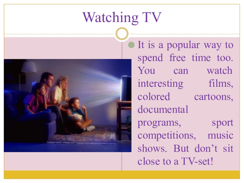 You can watch interesting films, colored cartoons, documental programs, sport competitions, music shows. But don’t sit close to a TV-set!