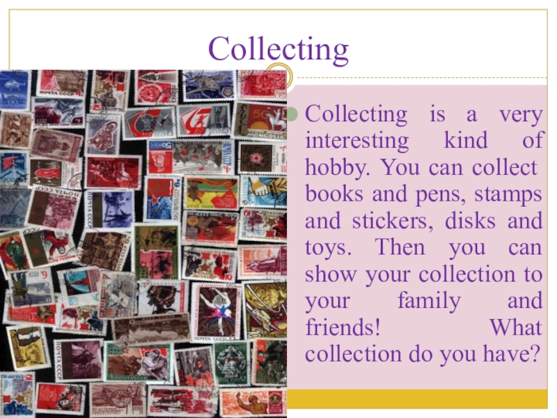 books and pens, stamps and stickers, disks and toys. Then you can show your collection to your family and friends! What collection do you have?
