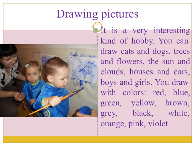 draw cats and dogs, trees and flowers, the sun and clouds, houses and cars, boys and girls. You draw with colors: red, blue, green, yellow, brown, grey, black, white, orange, pink, violet.
