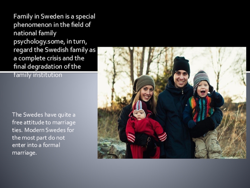 The Swedes have quite a free attitude to marriage ties. Modern Swedes for the most part do not enter into a formal marriage.