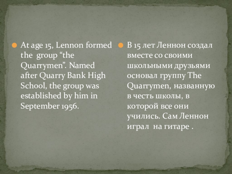 В 15 лет Леннон создал вместе со своими школьными друзьями основал группу The Quarrymen, названную в честь школы, в которой все они учились. Сам Леннон играл на гитаре .