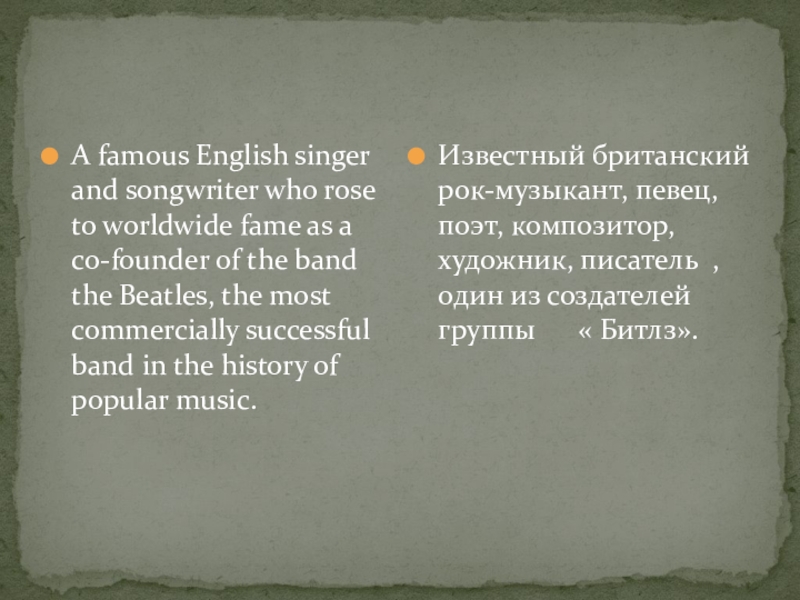 Известный британский рок-музыкант, певец, поэт, композитор, художник, писатель , один из создателей группы « Битлз».