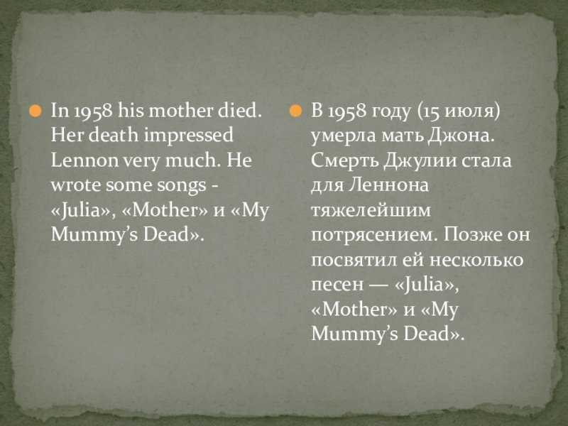 В 1958 году (15 июля) умерла мать Джона. Смерть Джулии стала для Леннона тяжелейшим потрясением. Позже он посвятил ей несколько песен — «Julia», «Mother» и «My Mummy’s Dead».