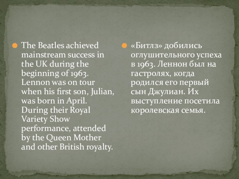 «Битлз» добились оглушительного успеха в 1963. Леннон был на гастролях, когда родился его первый сын Джулиан. Их выступление посетила королевская семья.