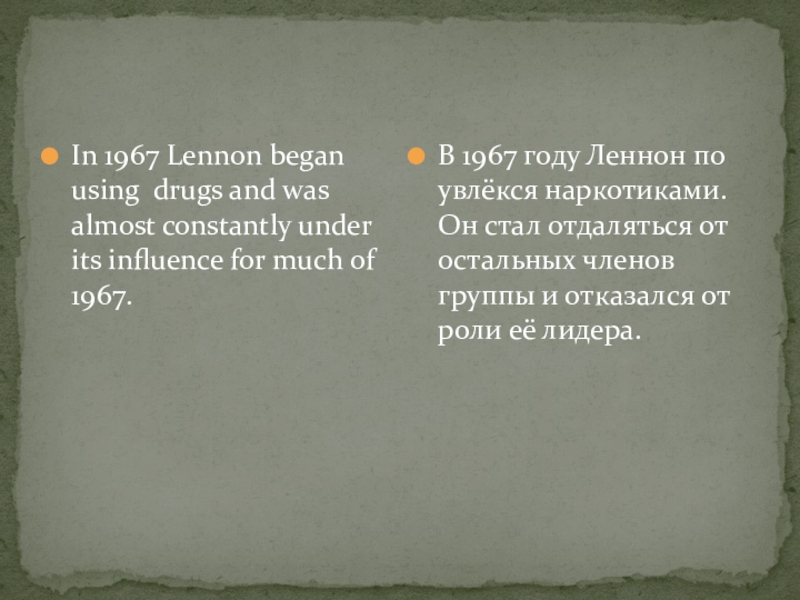 В 1967 году Леннон по увлёкся наркотиками. Он стал отдаляться от остальных членов группы и отказался от роли её лидера.