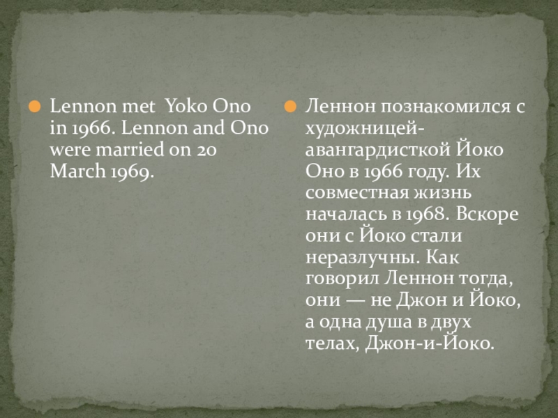 Леннон познакомился с художницей-авангардисткой Йоко Оно в 1966 году. Их совместная жизнь началась в 1968. Вскоре они с Йоко стали неразлучны. Как говорил Леннон тогда, они — не Джон и Йоко, а одна душа в двух телах, Джон-и-Йоко.