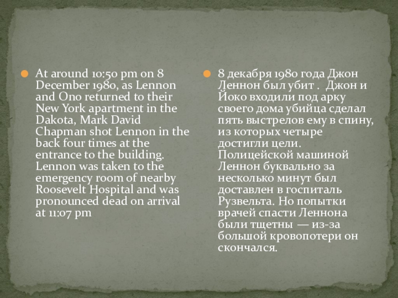 8 декабря 1980 года Джон Леннон был убит . Джон и Йоко входили под арку своего дома убийца cделал пять выстрелов ему в спину, из которых четыре достигли цели. Полицейской машиной Леннон буквально за несколько минут был доставлен в госпиталь Рузвельта. Но попытки врачей спасти Леннона были тщетны — из-за большой кровопотери он скончался.