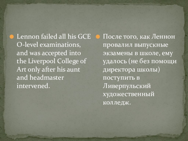 После того, как Леннон провалил выпускные экзамены в школе, ему удалось (не без помощи директора школы) поступить в Ливерпульский художественный колледж.