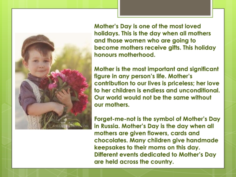 Слайд 6Mother’s Day is one of the most loved holidays. This is