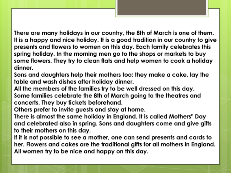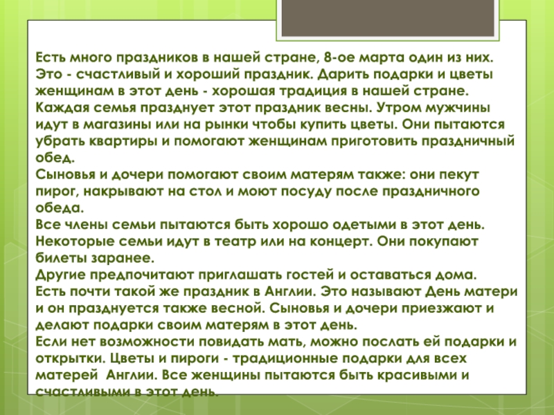 It is a happy and nice holiday. It is a good tradition in our country to give presents and flowers to women on this day. Each family celebrates this spring holiday. In the morning men go to the shops or markets to buy some flowers. They try to clean flats and help women to cook a holiday dinner.