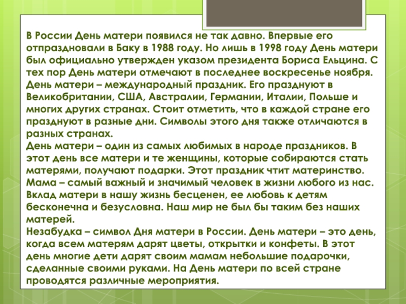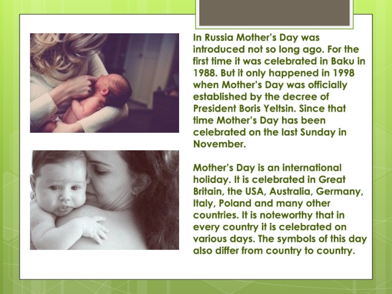 Слайд 5In Russia Mother’s Day was introduced not so long ago. For