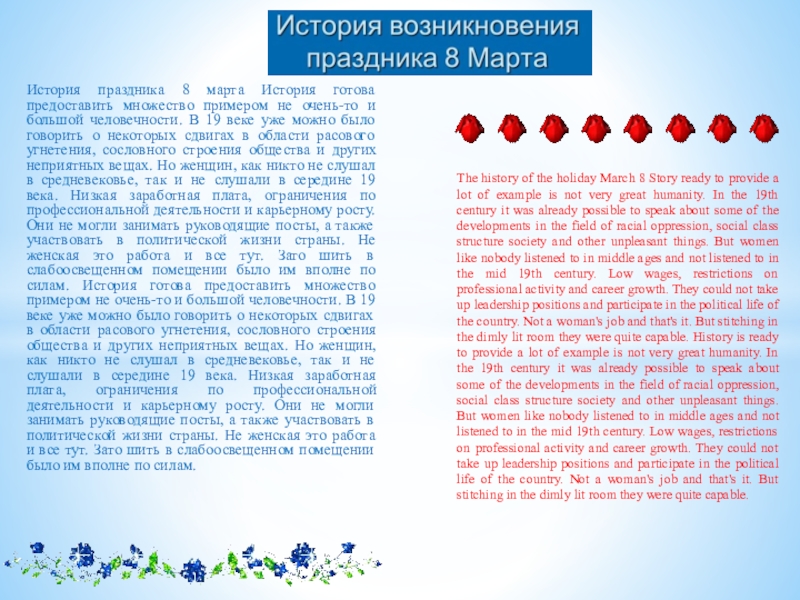 The history of the holiday March 8 Story ready to provide a lot of example is not very great humanity. In the 19th century it was already possible to speak about some of the developments in the field of racial oppression, social class structure society and other unpleasant things. But women like nobody listened to in middle ages and not listened to in the mid 19th century. Low wages, restrictions on professional activity and career growth. They could not take up leadership positions and participate in the political life of the country. Not a woman's job and that's it. But stitching in the dimly lit room they were quite capable. History is ready to provide a lot of example is not very great humanity. In the 19th century it was already possible to speak about some of the developments in the field of racial oppression, social class structure society and other unpleasant things. But women like nobody listened to in middle ages and not listened to in the mid 19th century. Low wages, restrictions on professional activity and career growth. They could not take up leadership positions and participate in the political life of the country. Not a woman's job and that's it. But stitching in the dimly lit room they were quite capable.