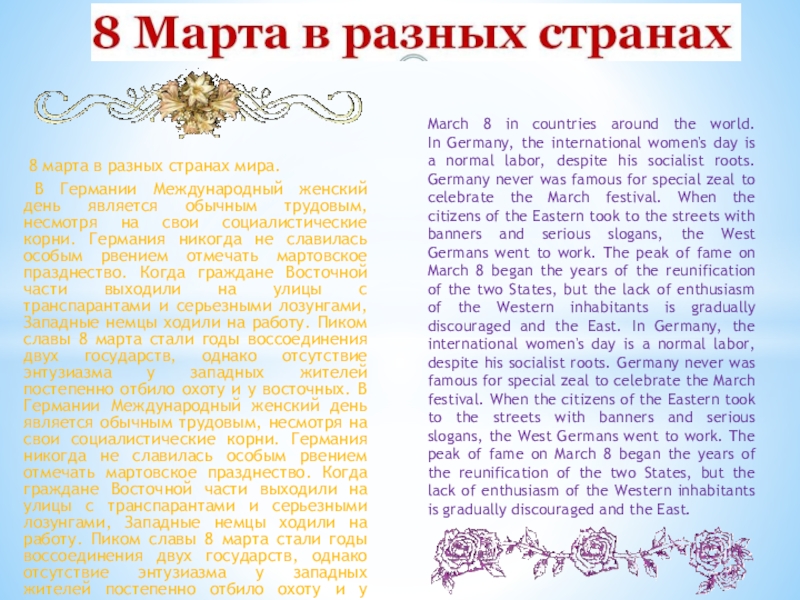 In Germany, the international women's day is a normal labor, despite his socialist roots. Germany never was famous for special zeal to celebrate the March festival. When the citizens of the Eastern took to the streets with banners and serious slogans, the West Germans went to work. The peak of fame on March 8 began the years of the reunification of the two States, but the lack of enthusiasm of the Western inhabitants is gradually discouraged and the East. In Germany, the international women's day is a normal labor, despite his socialist roots. Germany never was famous for special zeal to celebrate the March festival. When the citizens of the Eastern took to the streets with banners and serious slogans, the West Germans went to work. The peak of fame on March 8 began the years of the reunification of the two States, but the lack of enthusiasm of the Western inhabitants is gradually discouraged and the East.