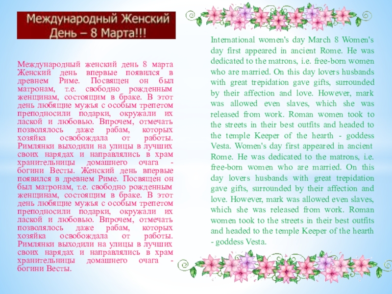 International women's day March 8 Women's day first appeared in ancient Rome. He was dedicated to the matrons, i.e. free-born women who are married. On this day lovers husbands with great trepidation gave gifts, surrounded by their affection and love. However, mark was allowed even slaves, which she was released from work. Roman women took to the streets in their best outfits and headed to the temple Keeper of the hearth - goddess Vesta. Women's day first appeared in ancient Rome. He was dedicated to the matrons, i.e. free-born women who are married. On this day lovers husbands with great trepidation gave gifts, surrounded by their affection and love. However, mark was allowed even slaves, which she was released from work. Roman women took to the streets in their best outfits and headed to the temple Keeper of the hearth - goddess Vesta.