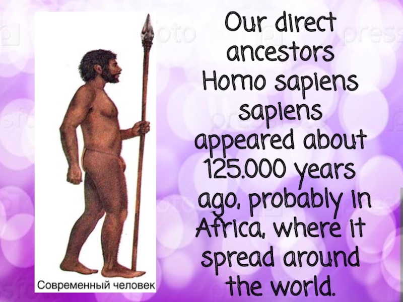 Слайд 7Our direct ancestors Homo sapiens sapiens appeared about 125.000 years ago,
