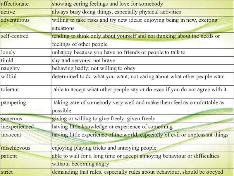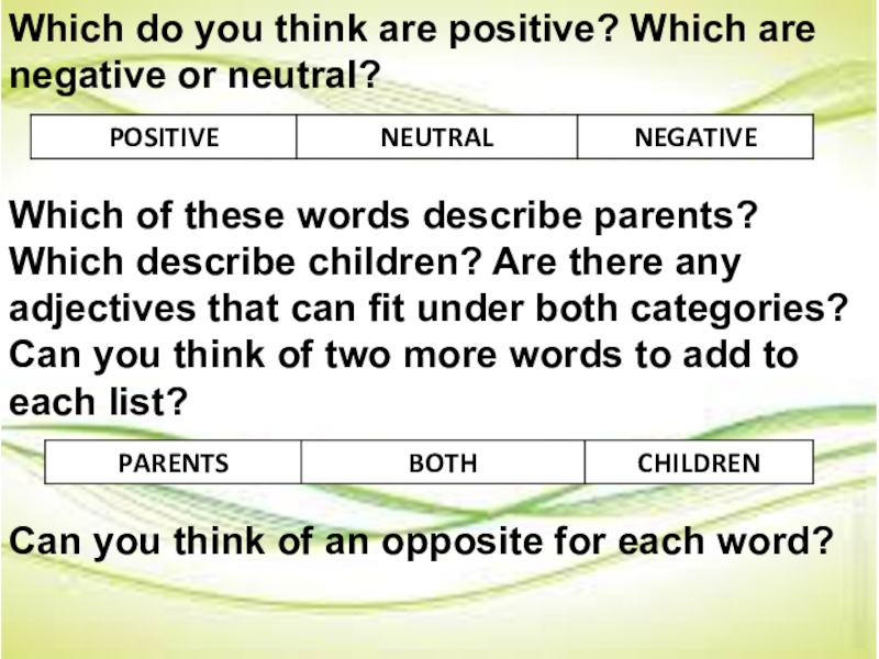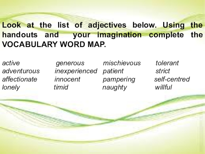 Look at the list of adjectives below. Using the handouts and your imagination complete the VOCABULARY WORD MAP.