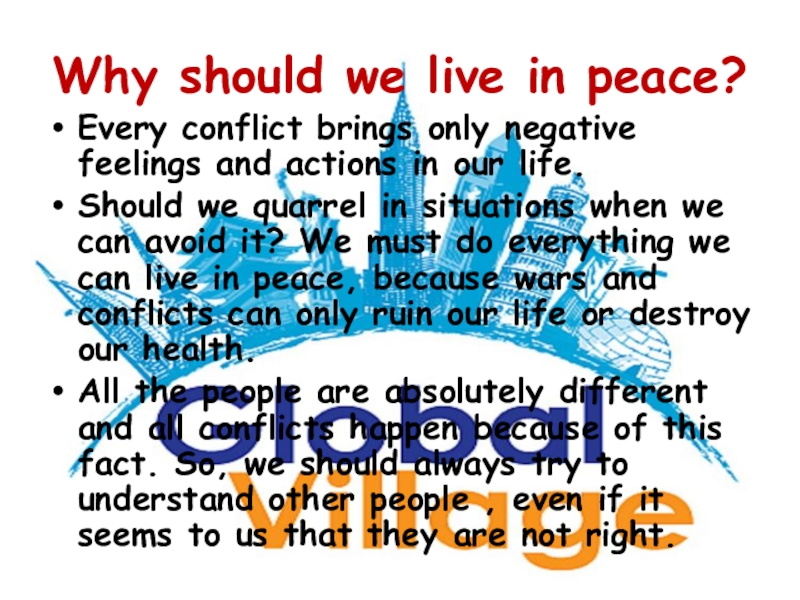 Why should we live in peace?Every conflict brings only negative feelings and actions in our life.Should we