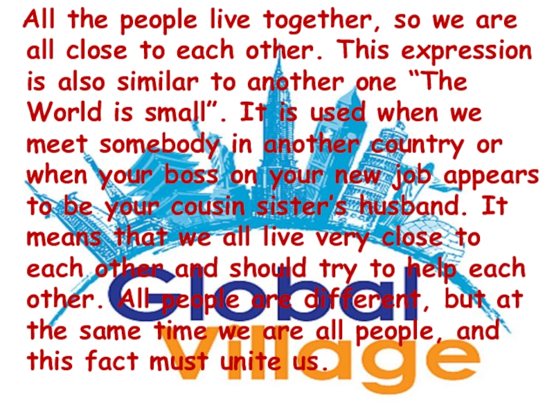 close to each other. This expression is also similar to another one “The World is small”. It is used when we meet somebody in another country or when your boss on your new job appears to be your cousin sister’s husband. It means that we all live very close to each other and should try to help each other. All people are different, but at the same time we are all people, and this fact must unite us.