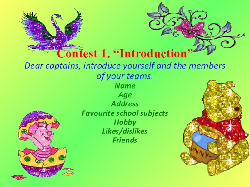 Contest 1. “Introduction” Dear captains, introduce yourself and the members of your teams. Name Age Address Favourite school subjects Hobby Likes/dislikes Friends