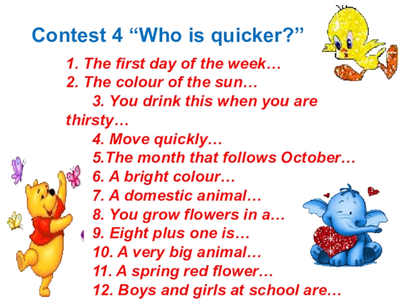 Contest 4 “Who is quicker?” 1. The first day of the week…2. The colour of the sun…
