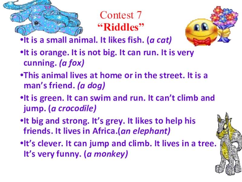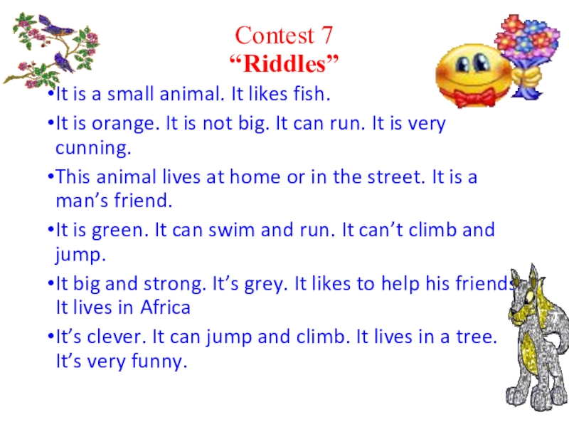 Contest 7 “Riddles” It is a small animal. It likes fish. (a cat)It is orange. It is