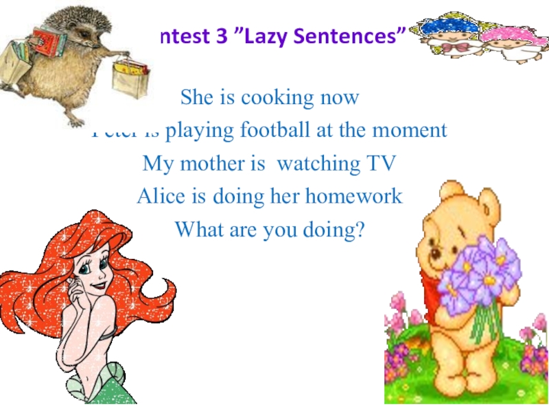 Contest 3 ”Lazy Sentences” She is cooking now  Peter is playing football at the moment