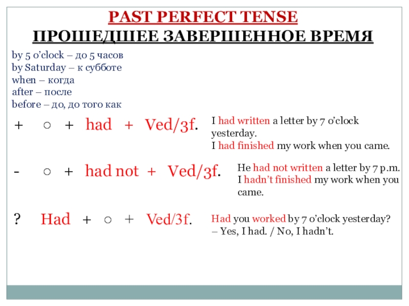 Had you worked by 7 o’clock yesterday? – Yes, I had. / No, I hadn’t.