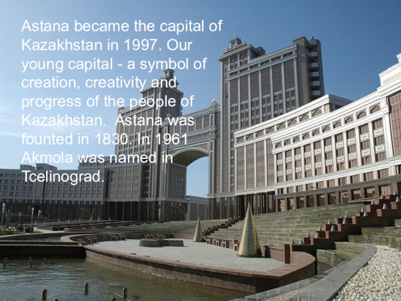 Astana became the capital of Kazakhstan in 1997. Our young capital - a symbol of creation, creativity and progress of the people of Kazakhstan. Astana was founted in 1830. In 1961 Akmola was named in Tcelinograd.