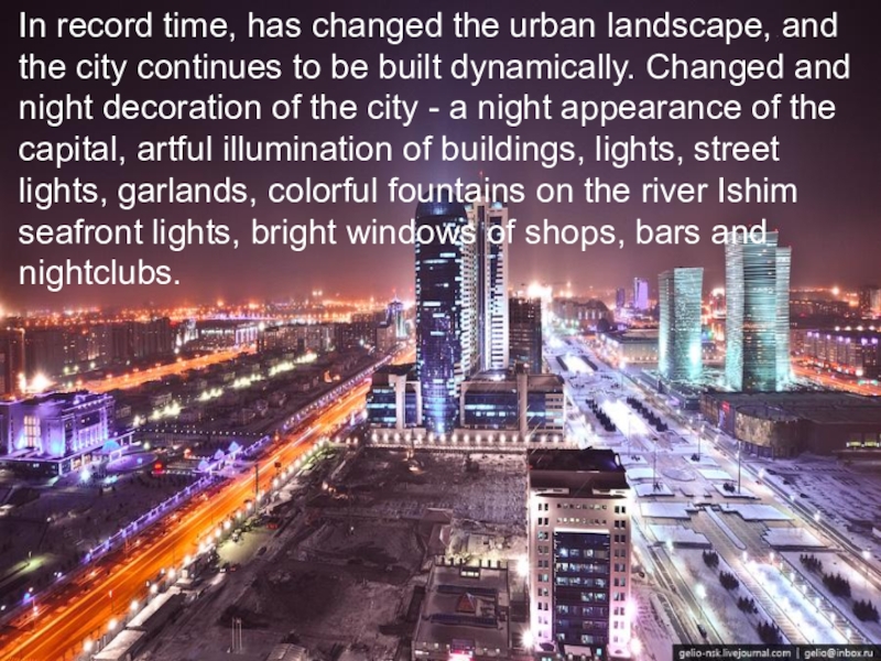 continues to be built dynamically. Changed and night decoration of the city - a night appearance of the capital, artful illumination of buildings, lights, street lights, garlands, colorful fountains on the river Ishim seafront lights, bright windows of shops, bars and nightclubs.