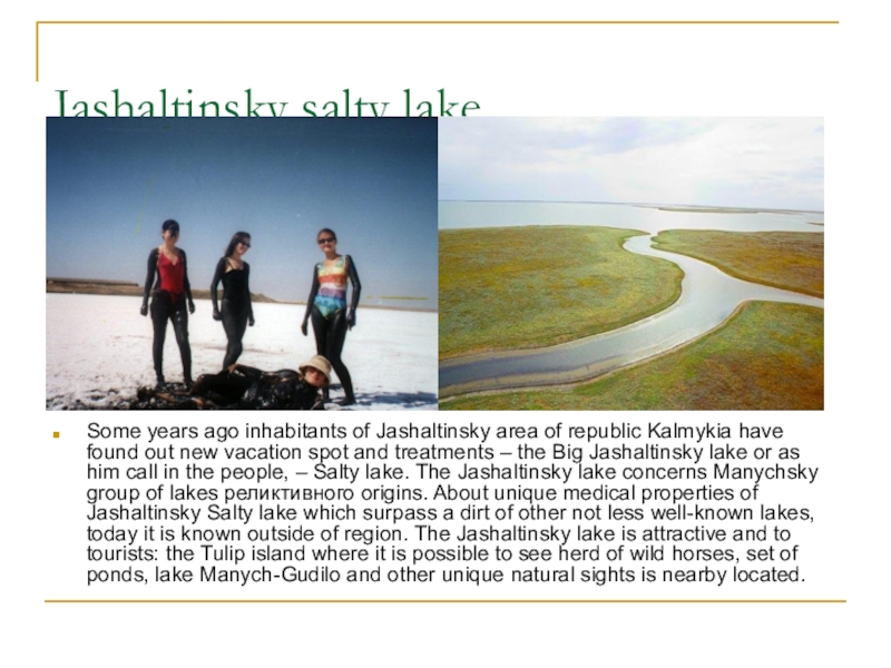 Kalmykia have found out new vacation spot and treatments – the Big Jashaltinsky lake or as him call in the people, – Salty lake. The Jashaltinsky lake concerns Manychsky group of lakes реликтивного origins. About unique medical properties of Jashaltinsky Salty lake which surpass a dirt of other not less well-known lakes, today it is known outside of region. The Jashaltinsky lake is attractive and to tourists: the Tulip island where it is possible to see herd of wild horses, set of ponds, lake Manych-Gudilo and other unique natural sights is nearby located.