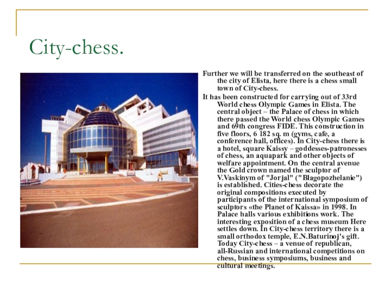 It has been constructed for carrying out of 33rd World chess Olympic Games in Elista. The central object – the Palace of chess in which there passed the World chess Olympic Games and 69th congress FIDE. This construction in five floors, 6 182 sq. m (gyms, cafe, a conference hall, offices). In City-chess there is a hotel, square Kaissy – goddesses-patronesses of chess, an aquapark and other objects of welfare appointment. On the central avenue the Gold crown named the sculptor of V.Vaskinym of "Jorjal" ("Blagopozhelanie") is established. Cities-chess decorate the original compositions executed by participants of the international symposium of sculptors «the Planet of Kaissa» in 1998. In Palace halls various exhibitions work. The interesting exposition of a chess museum Here settles down. In City-chess territory there is a small orthodox temple, E.N.Baturinoj's gift. Today City-chess – a venue of republican, all-Russian and international competitions on chess, business symposiums, business and cultural meetings.