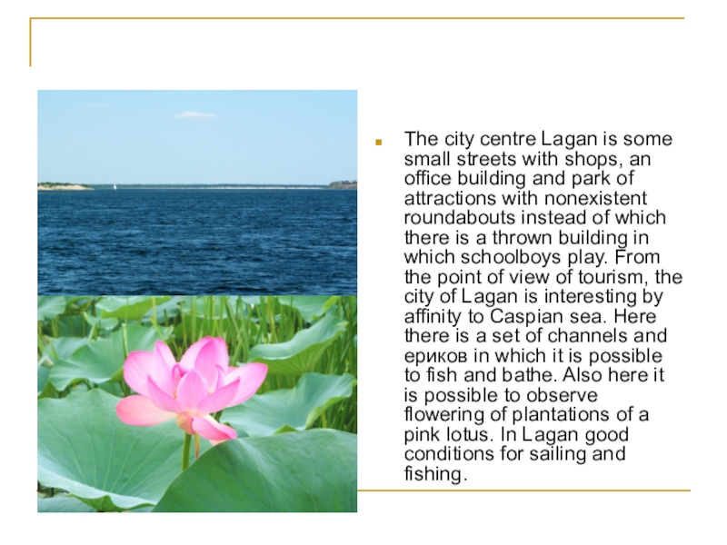 office building and park of attractions with nonexistent roundabouts instead of which there is a thrown building in which schoolboys play. From the point of view of tourism, the city of Lagan is interesting by affinity to Caspian sea. Here there is a set of channels and ериков in which it is possible to fish and bathe. Also here it is possible to observe flowering of plantations of a pink lotus. In Lagan good conditions for sailing and fishing.