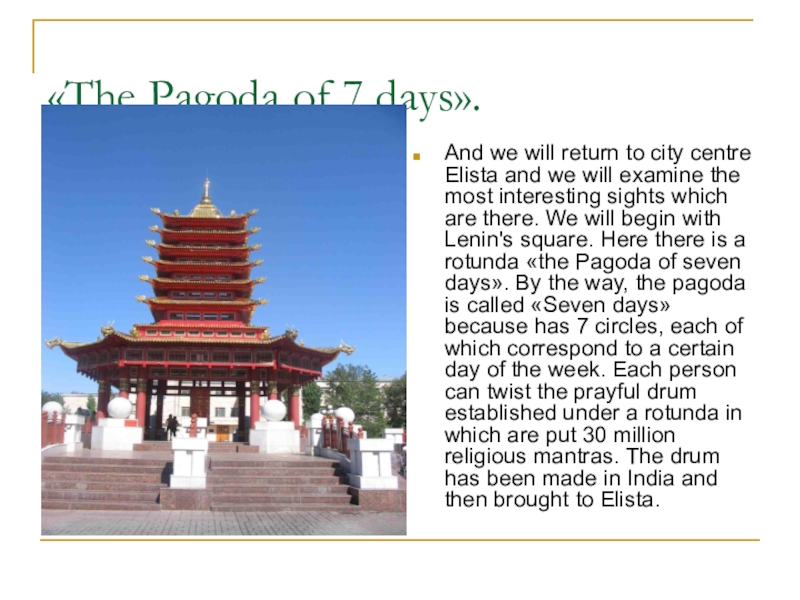 Elista and we will examine the most interesting sights which are there. We will begin with Lenin's square. Here there is a rotunda «the Pagoda of seven days». By the way, the pagoda is called «Seven days» because has 7 circles, each of which correspond to a certain day of the week. Each person can twist the prayful drum established under a rotunda in which are put 30 million religious mantras. The drum has been made in India and then brought to Elista.