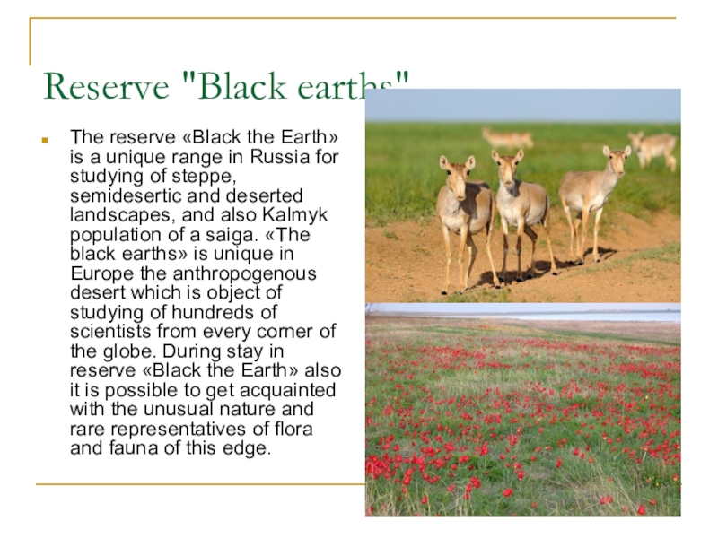 in Russia for studying of steppe, semidesertic and deserted landscapes, and also Kalmyk population of a saiga. «The black earths» is unique in Europe the anthropogenous desert which is object of studying of hundreds of scientists from every corner of the globe. During stay in reserve «Black the Earth» also it is possible to get acquainted with the unusual nature and rare representatives of flora and fauna of this edge.