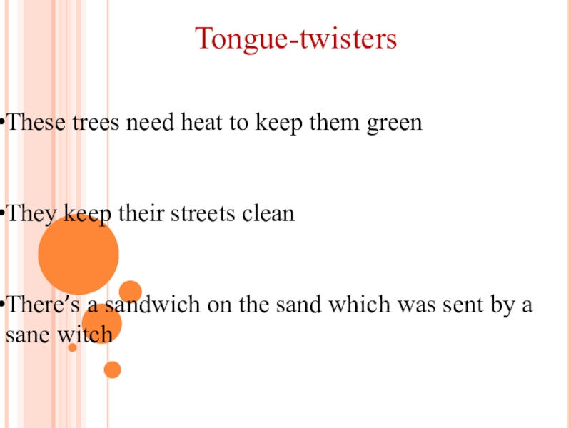 Tongue-twistersThese trees need heat to keep them greenThey keep their streets cleanThere’s a sandwich on the sand which was sent by a sane witch