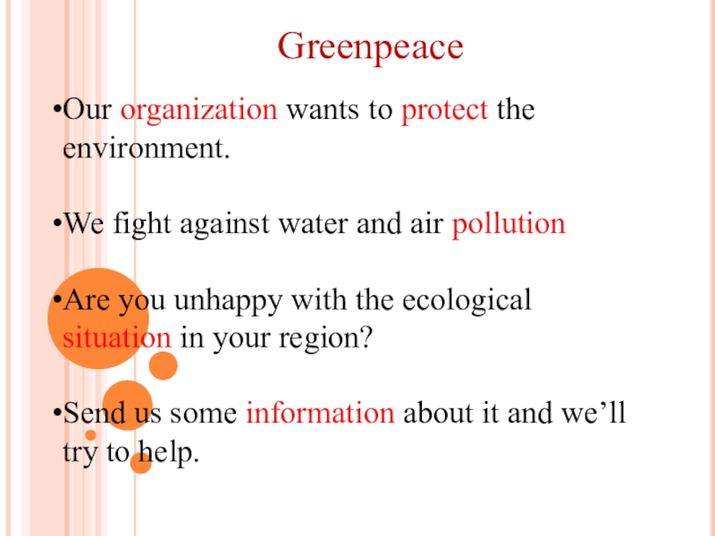 GreenpeaceOur organization wants to protect the environment.We fight against water and air pollutionAre you unhappy with the