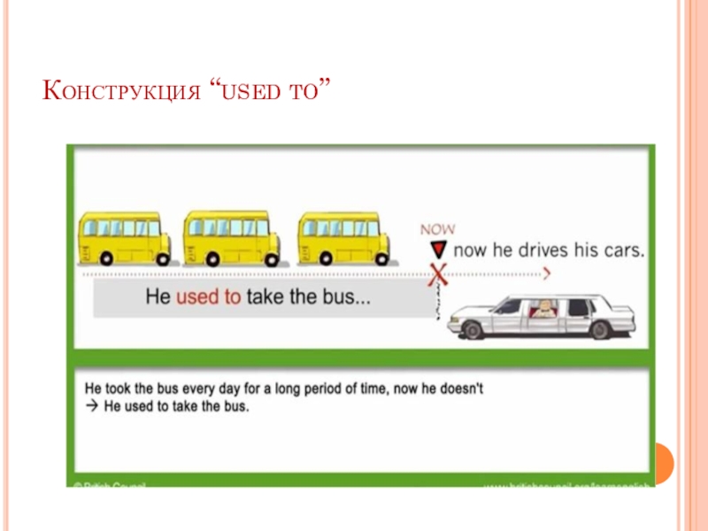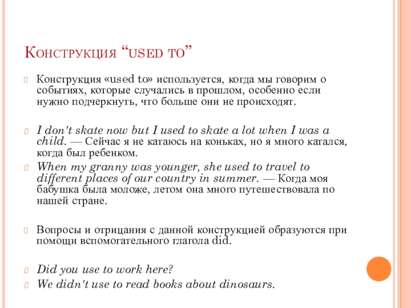 Конструкция “used to”Конструкция «used to» используется, когда мы говорим о событиях, которые случались в прошлом, особенно если